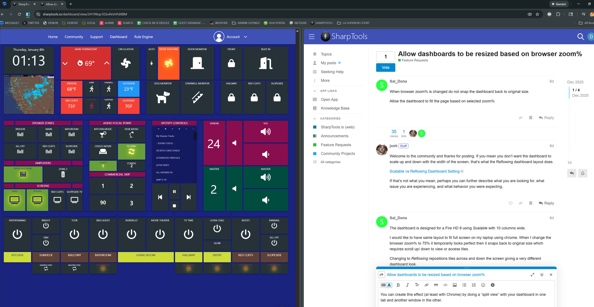 You can create this effect (at least with Chrome) by doing a âsplit viewâ with your dashboard in one tab and another window in the other, like in the picture below. That dashboard normally wonât fit entirely on my screen and I canât change the zoom. But doing the split tab thing allows me to see all of it at once.