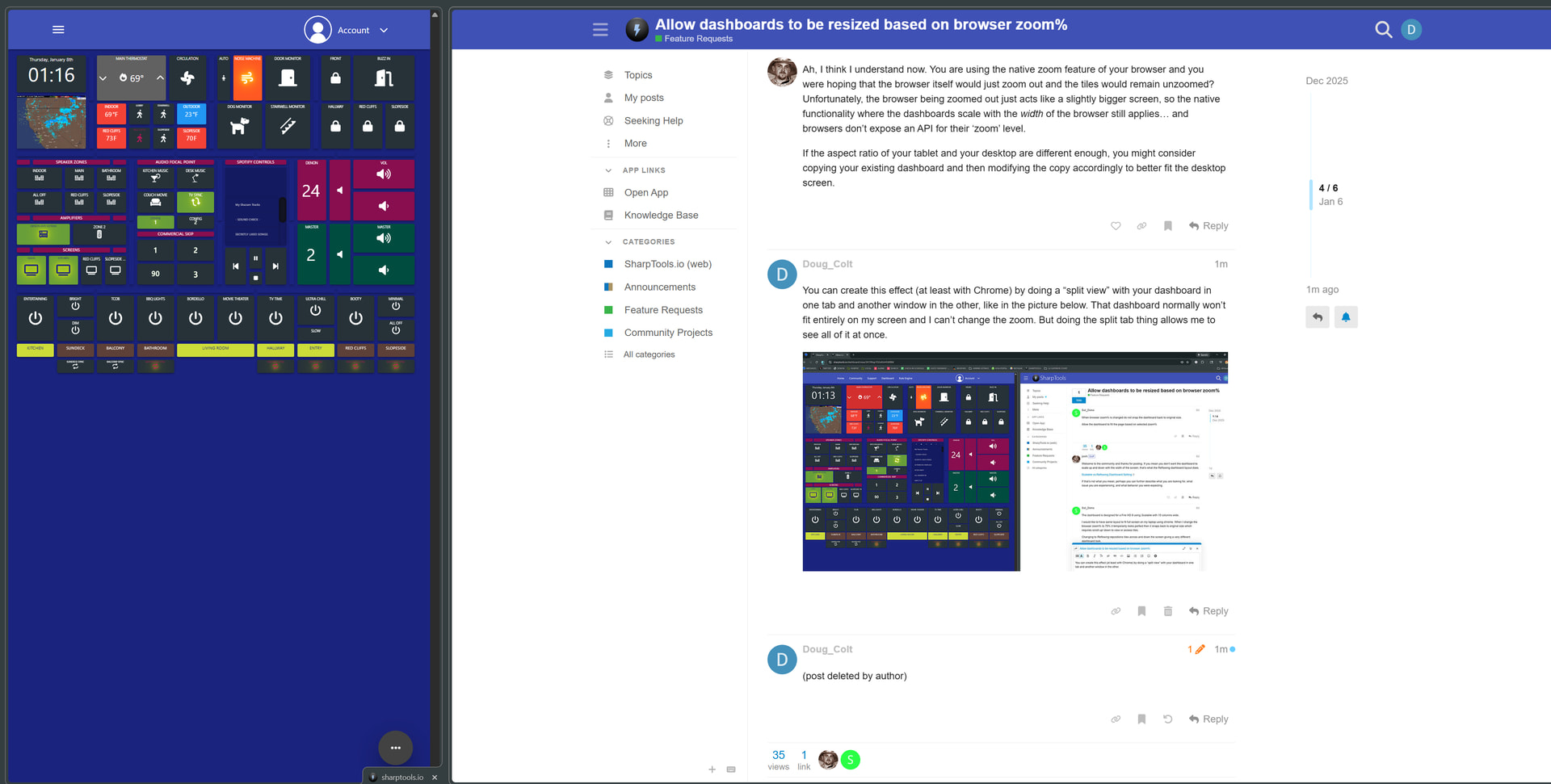 Forgot to add, then you can just move the center slider to adjust the respective sizes of the two tabs. This lets you test your dashboard in any size/zoom level as you see here.