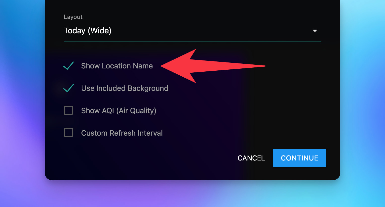 The Today (Wide) layout supports displaying the city name. For other layouts, you could use the ‘Label’ setting on the instance of the tile you add to your dashboard for a static label centered at the top of the tile.