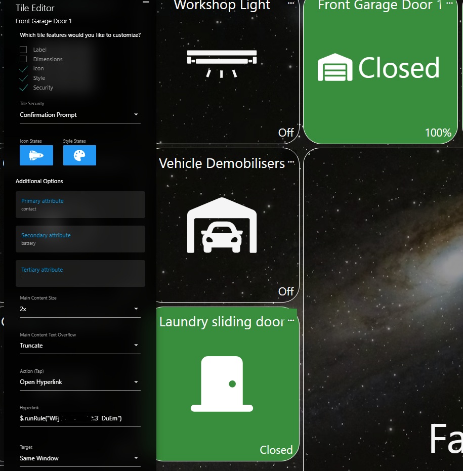 I have Contact sensor tile for my Garage door and is set to Hero Attribute on my dashboard so I can run a rule to open/close the door when its pressed. I have enabled the confirmation prompt in the tile to prevent any accidental triggering when scrolling through dashboards especially when away from home.
