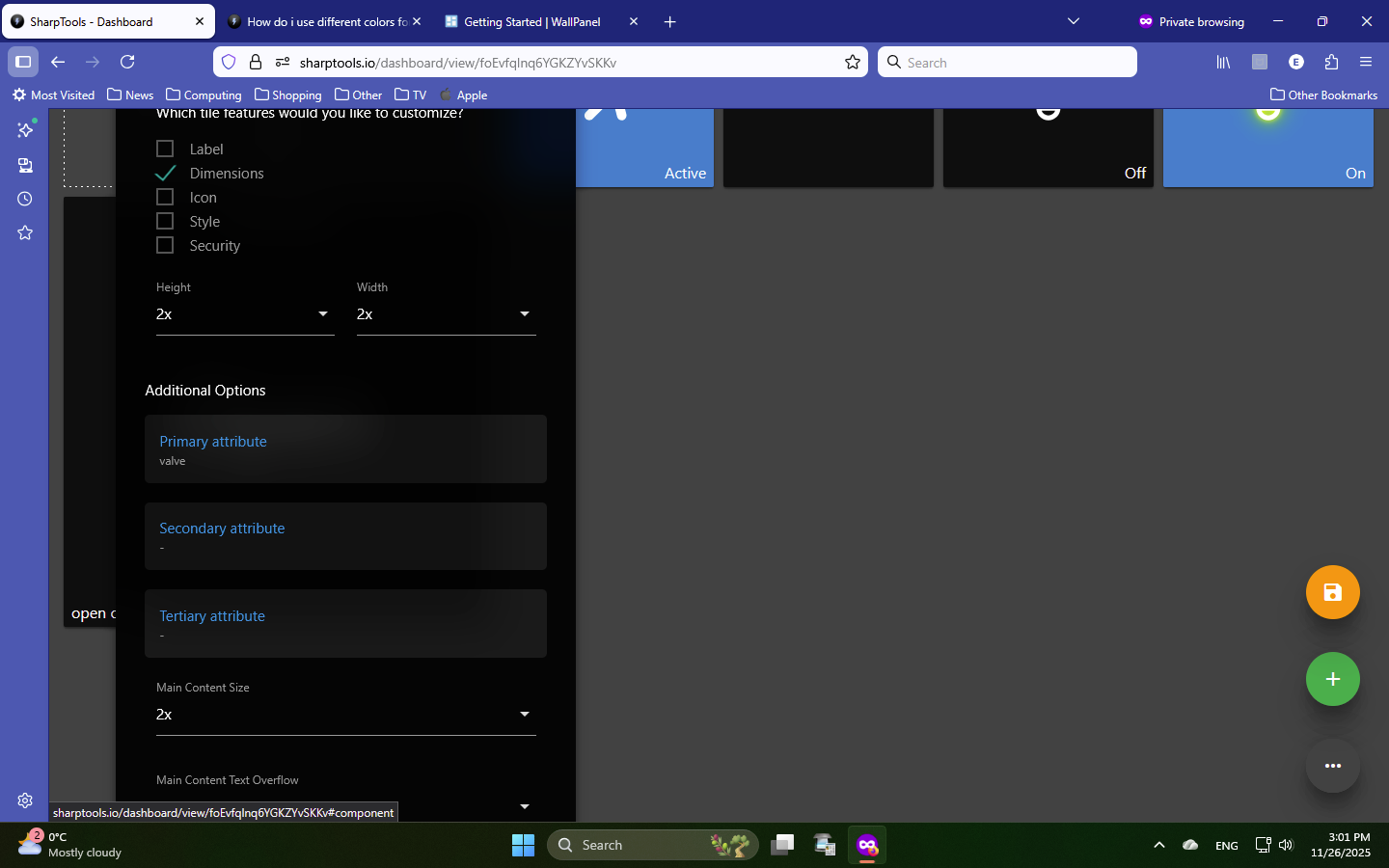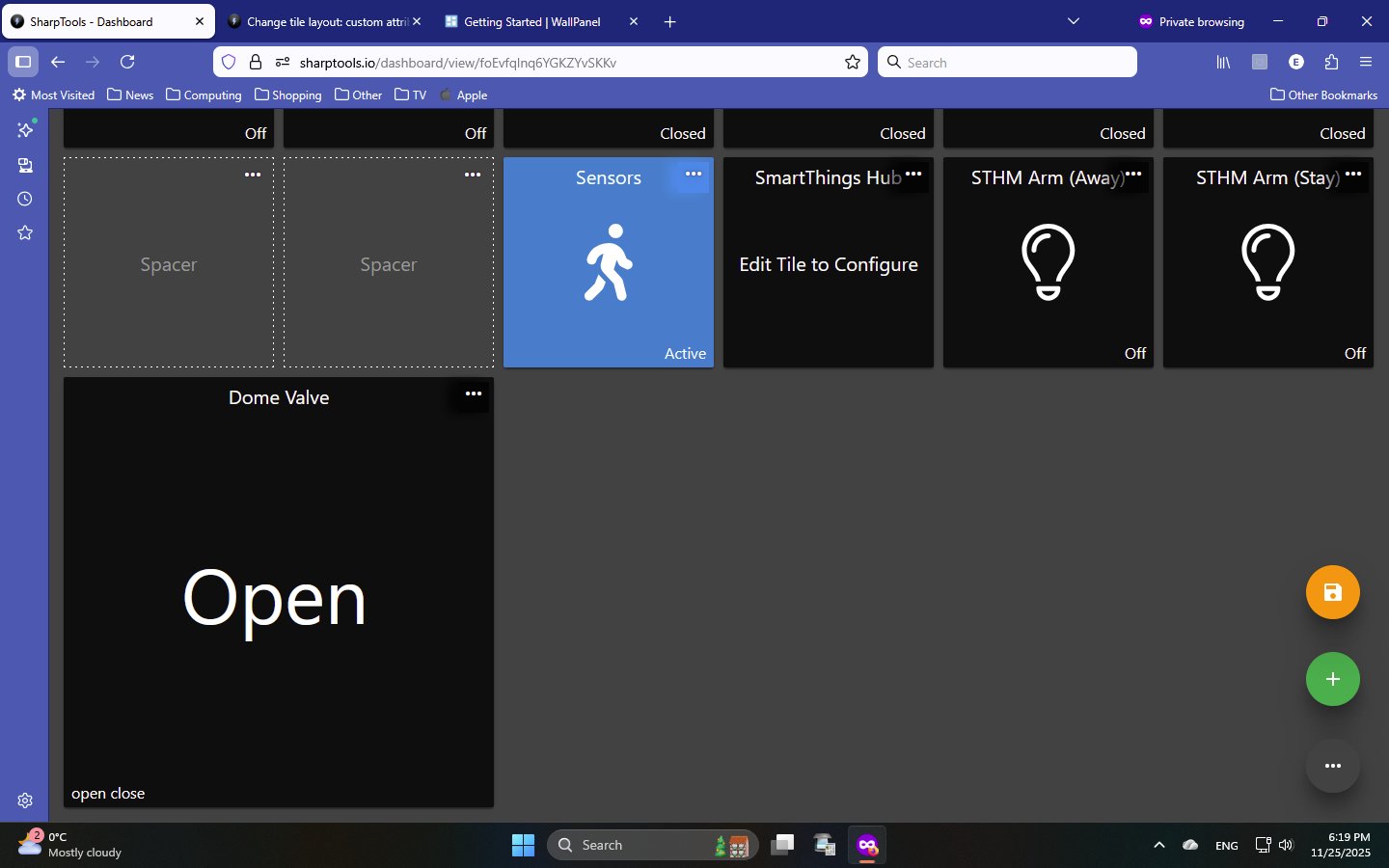 New question: I imported from Smartthings, and my garage door correctly shows on sharptools as open or closed. But I have a main water valve which should be the same (open or closed). It currently says Open (which is correct) and in the bottom left corner says “Open. Close”. Is there some way to configure it so that the “Open Close” options disappear and only the status appears on the tile (and as the status changes, the tile changes)?