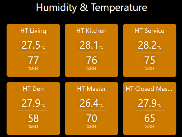 The screenshot above shows multiple instances of the tile monitoring different rooms. Notice how the orange/yellow coloring immediately identifies rooms with elevated temperature and humidity levels, while comfortable rooms display in white.