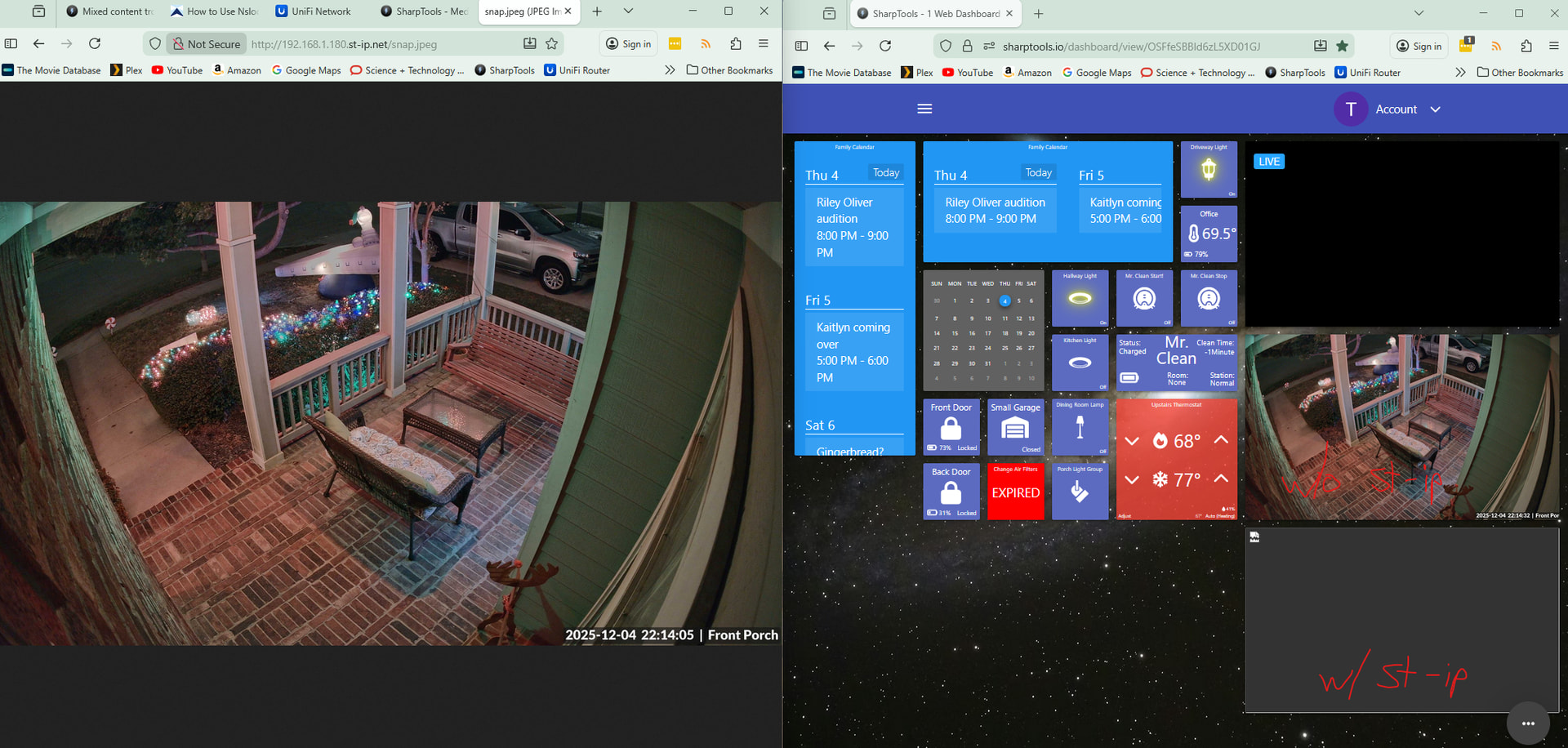 If it were a DNS issue, wouldn’t we expect it to always fail on that client? Here I’ve got two firefox windows open. On the left I’m looking at the camera URL (using st-ip) and it works fine. But in a test dashboard it doesn’t - you can see the tile without st-ip works but the one with it doesn’t.