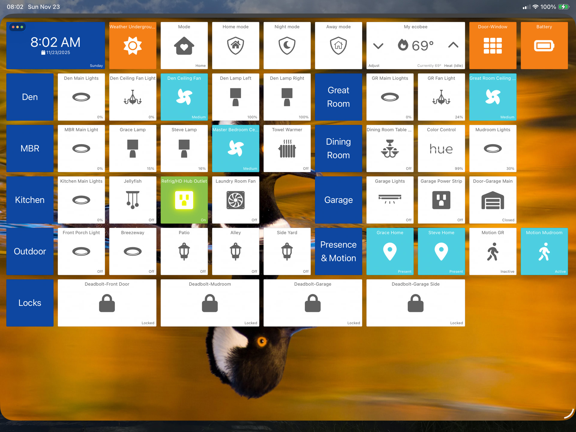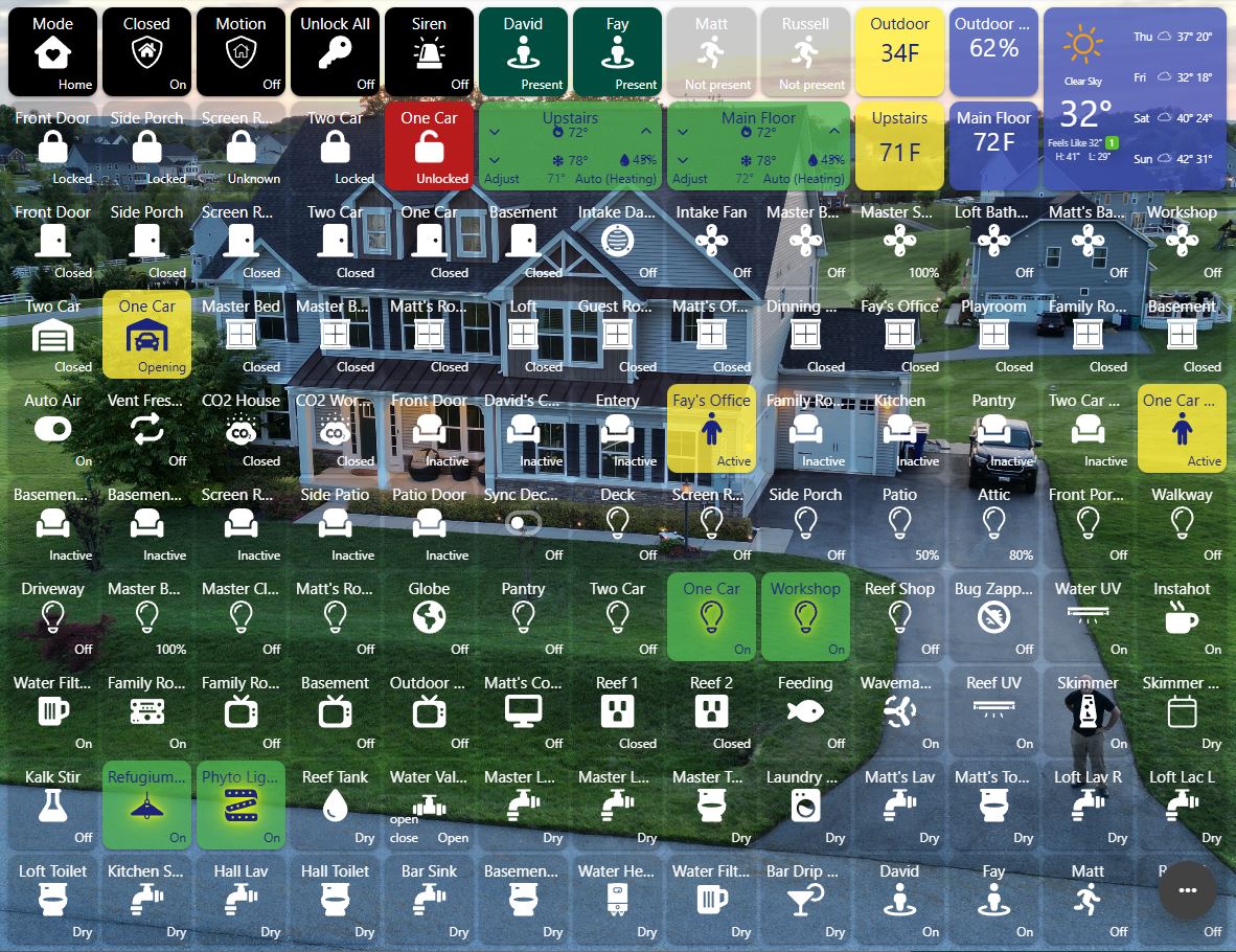 - Home Mode changes with someone present, armed when no one is home and thermostats increase range and garage doors closed and all door looked and lights some devices are turned off.