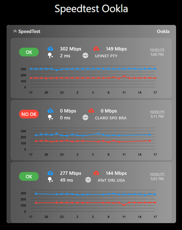 A grade network monitoring tile that displays ** up to 3 simultaneous speed test locations** with synchronized historical charts and real-time status indicators - powered by Ookla Speedtest CLI data.