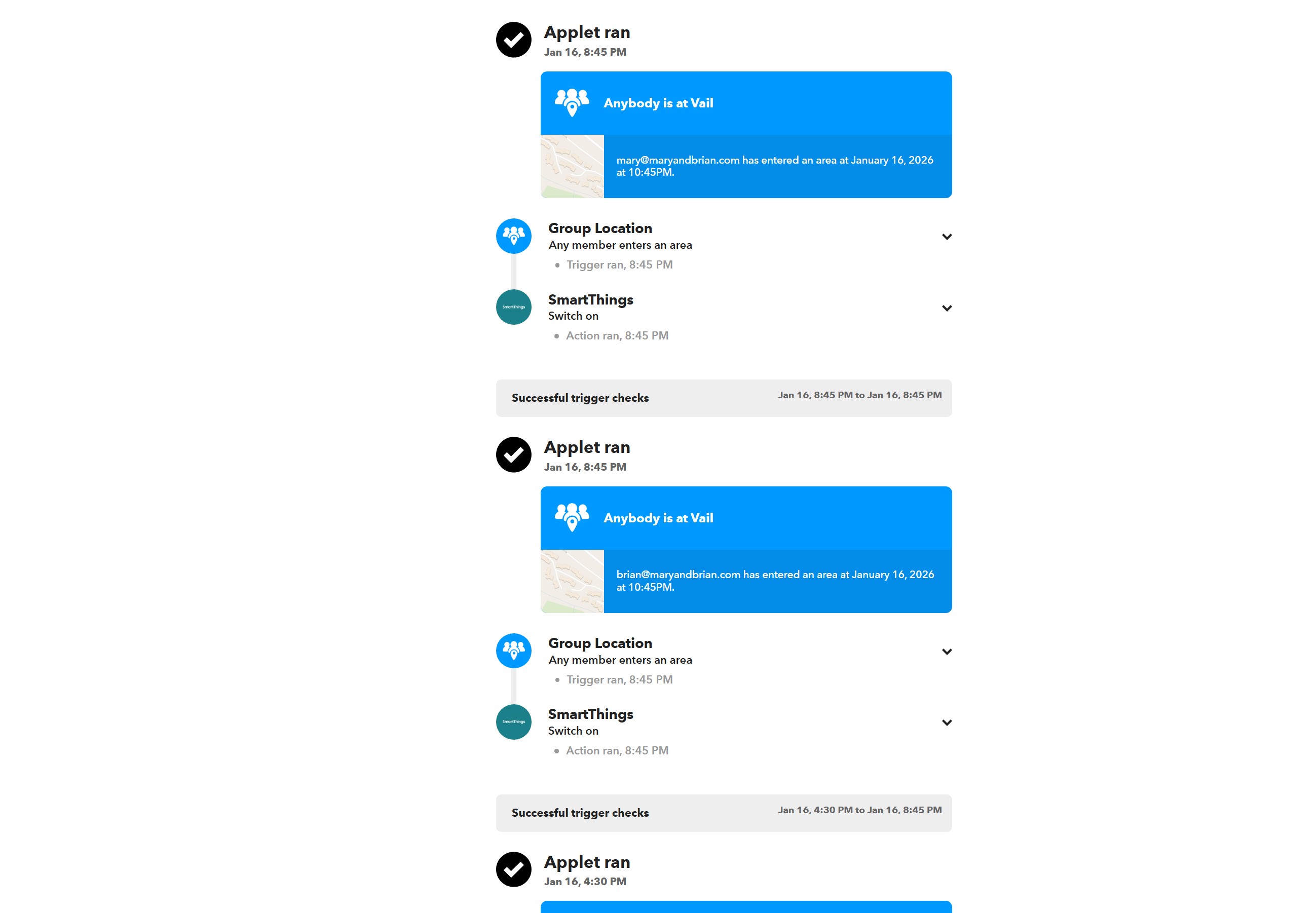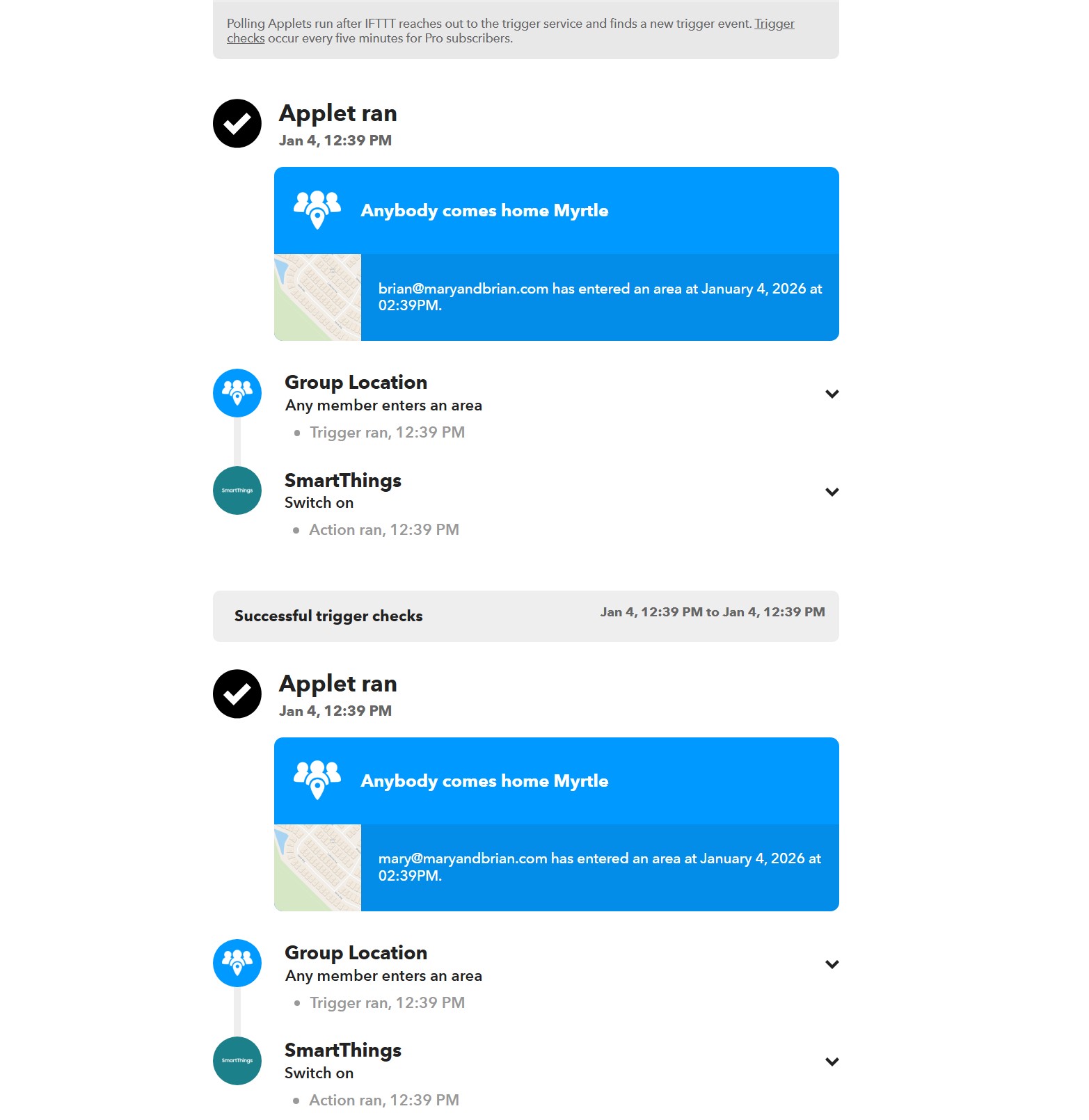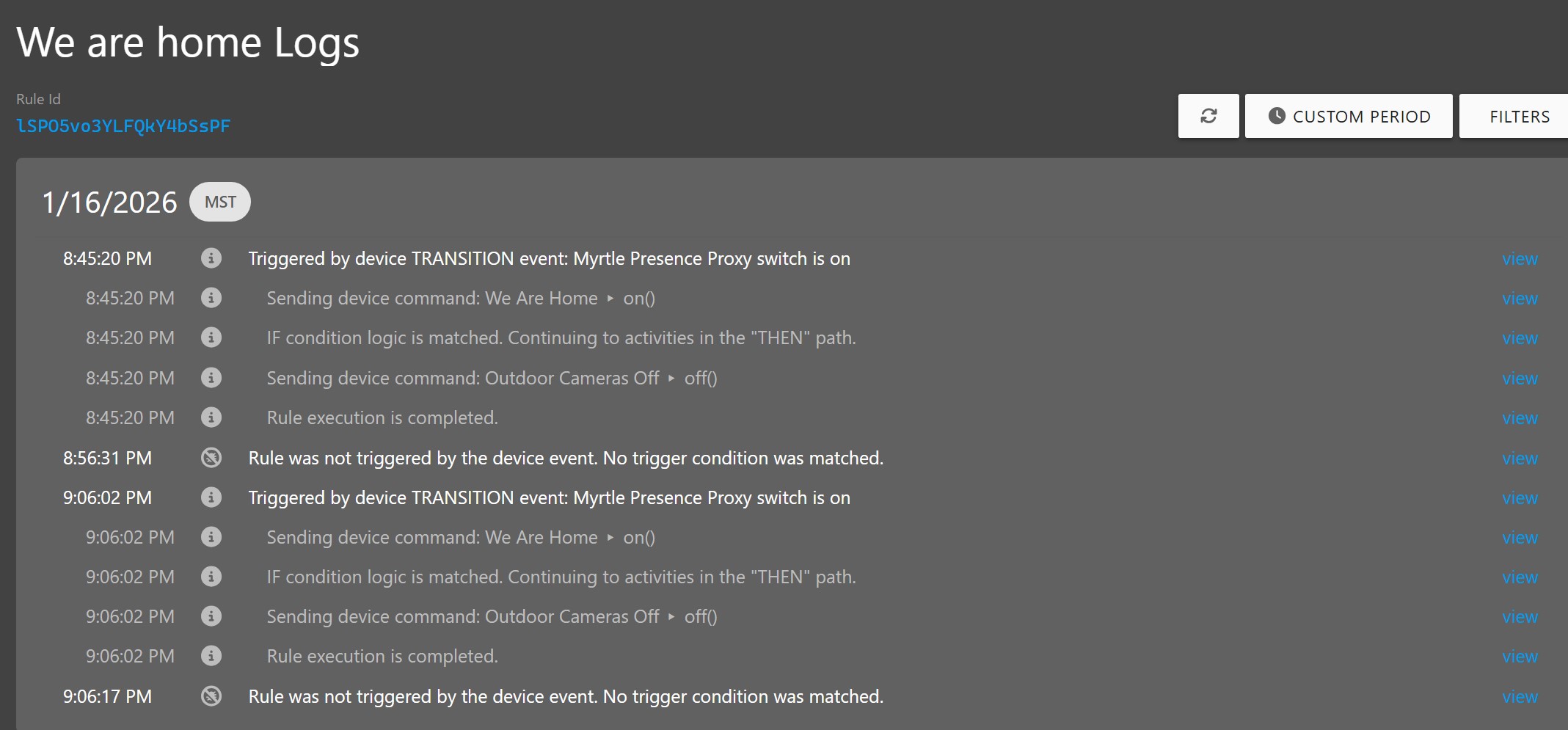 All conditions are false, but this rule appears to be filing regardless. Colorado devices are all prefaced by CO: and I have check the rules and find NO reference in the Colorado rules to these variables (it would be great to have the feature request for tracing variables to rules available, but a manual check shows none of these referenced. It appears for some odd reason both the CO: At Home Vail and We are home for South Carolina are both triggering when we are home in Colorado, even though we are 1900 miles apart. Has something changed that would cause this, as I said this has never happened in the past. I should note I have made one change in this rule, there are 2 presence proxy variables which are set by either IFTTT or smarthings based on presence of 2 phones (this was at the time having issues with IOS presence). I have checked the IFTTT rules and that side has not fired for Myrtle, only Colorado has fired. See below Myrtle has not fired since 1/4