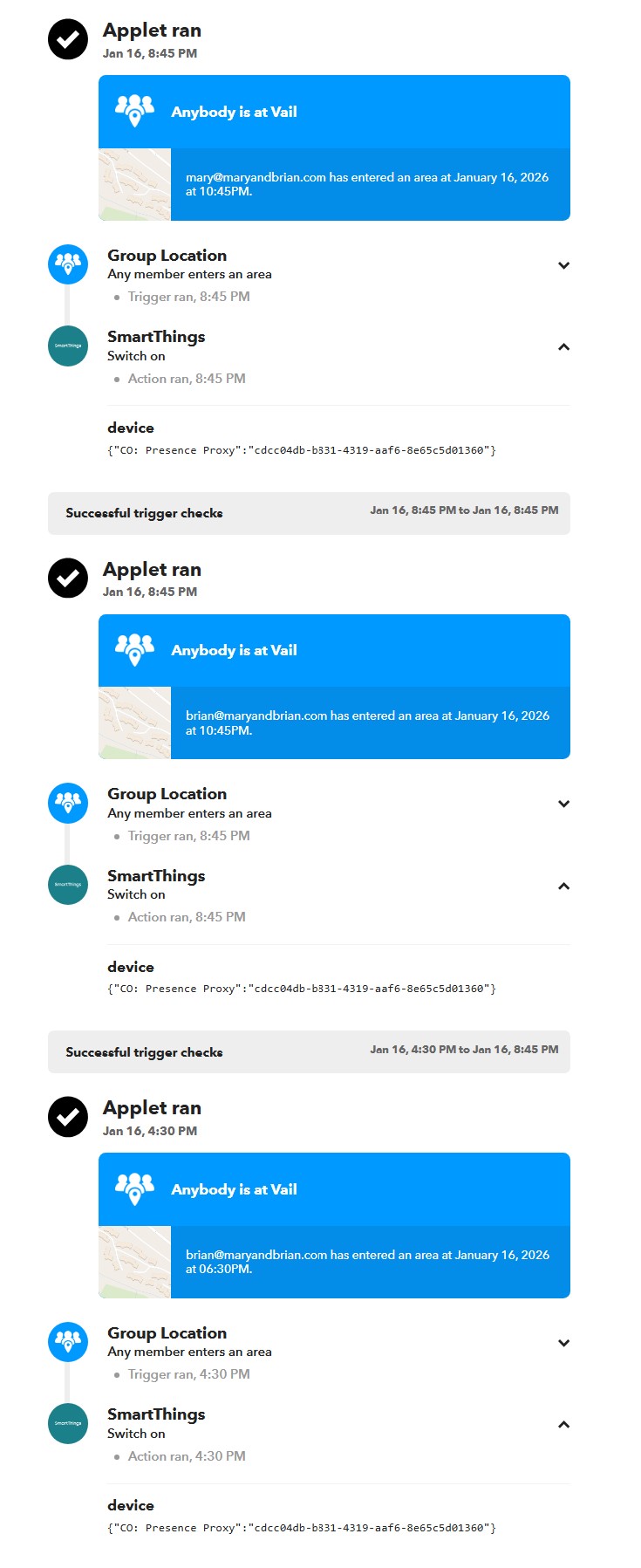 The thing that is odd is the IFTTT rule that ran sets CO: Presence Proxy NOT the myrtle presence proxy. The rule that sets that hasnt executed since 1/4